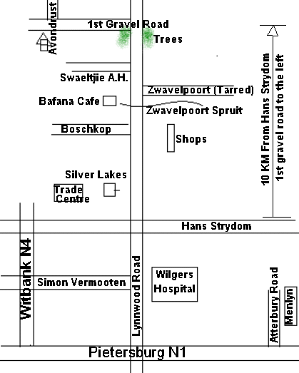 Travelling east on Lynnwood Road, the gravel road that leads to Avondrust Riding Centre, is 10 km from Hans Strydom Road.